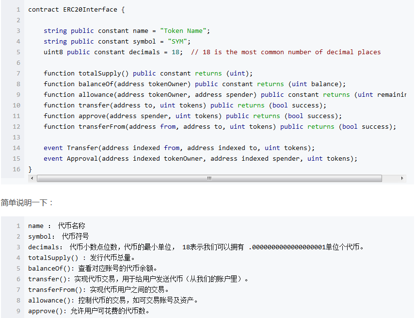 這里也介紹一下ERC20,這是以太坊定義的令牌標(biāo)準(zhǔn)。這個(gè)標(biāo)準(zhǔn)要求我們?cè)趯?shí)現(xiàn)代幣時(shí)必須遵守約定。只有支持協(xié)議,才能得到以太坊錢包的支持。下面是協(xié)議代碼界面??床欢矝]關(guān)系。程序員就能搞定。